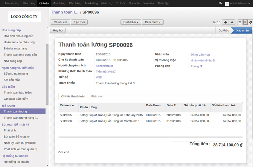 Một Thanh toán lương sau khi tạo mới sẽ có trạng thái là Dự thảo, bạn cần phải nhấp chuột vào nút Tạo chi tiết thanh toán để hệ thống tính toán và liệt kê ra các phiếu lương cần thanh toán. Thông tin Số tiền phải trả trên mỗi phiếu lương là số tiền còn lại bạn phải trả trên phiếu lương đó và nó sẽ được tính toán một cách tự động. Bạn chỉ việc nhập Số tiền thanh toán, là số tiền mà bạn sẽ hoặc đã thanh toán trên mỗi phiếu lương tương ứng với lần thanh toán này.